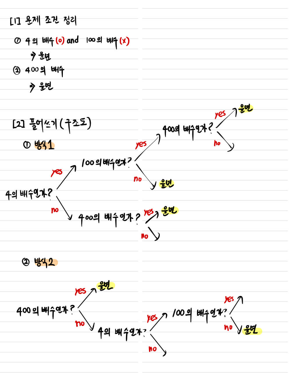 방식 1과 마찬가지로 논리 구조를 그대로 코드에 옮겼다. 아까 미쳐 말하지 못했지만, 이처럼 질문(조건)의 순서를 바꾸는 것 만으로도 단계를 나누는 경우의 수가 확 줄어들 수 있다. 만약, 확률론을 깊이 공부해본 학생이라면 '수형도'에서도 비슷한 상황이 벌어졌던 기억이 있을 것이다.