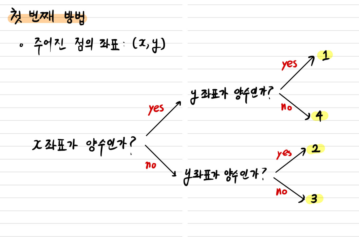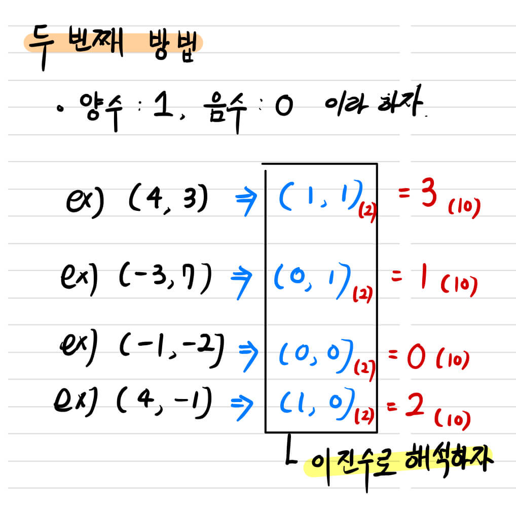 그런데 이때, y좌표가 양수인가?라는 질문이 2개인게 조금 불편하다. 그렇기에 좀 더 효율적으로 알고리즘을 구현할 수 있지 않을까? 라는 생각을 떠올리는 것이 당연하다. 이에 더불어 이진논리를 알고 있다면 금상천화이다.