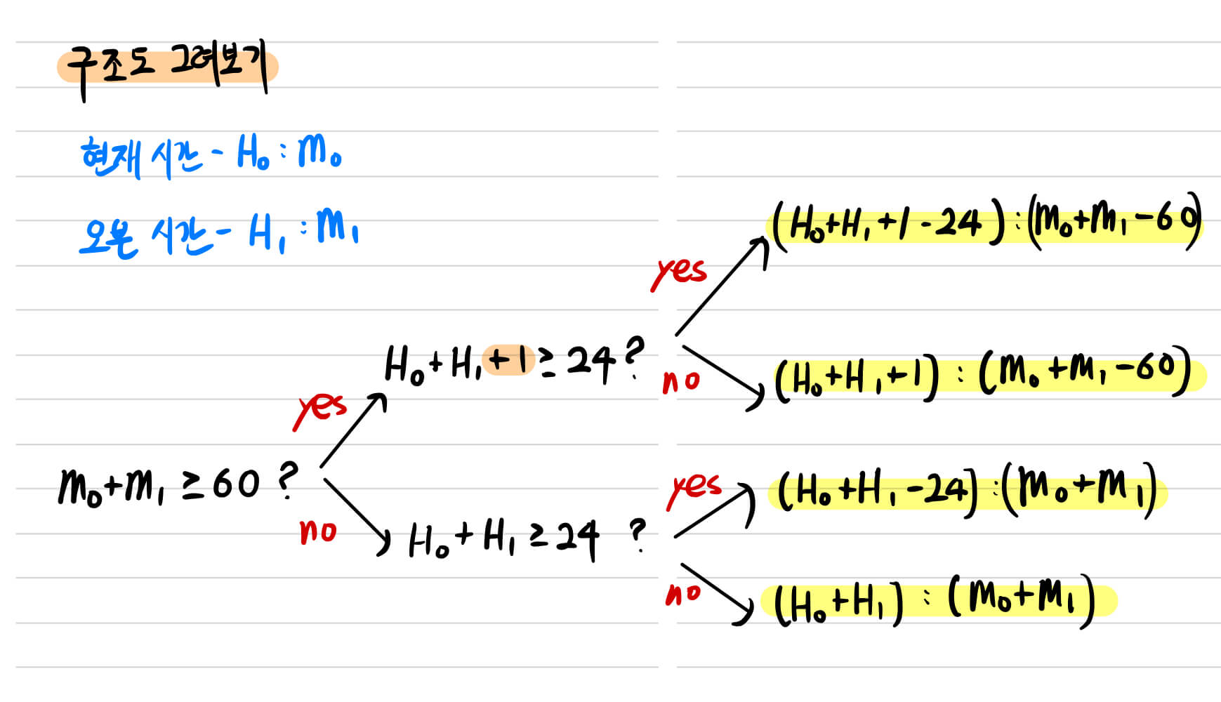 지난 시간 알람시계를 100% 이해했다면, 별반 다를 바 없는 문제이다. 마찬가지로 첫번째 풀이로는 '구조도'를 그려보아야 한다. 물론, 알람시계 문제의 두번째 풀이에 익숙해졌다면 바로 시간 + 분 -> 분단위로 고친 뒤 나머지 연산을 이용하여 조건문 없이 해결할 수도 있다. 그러나, 일단은 구조도 부터 그려보도록 하자.