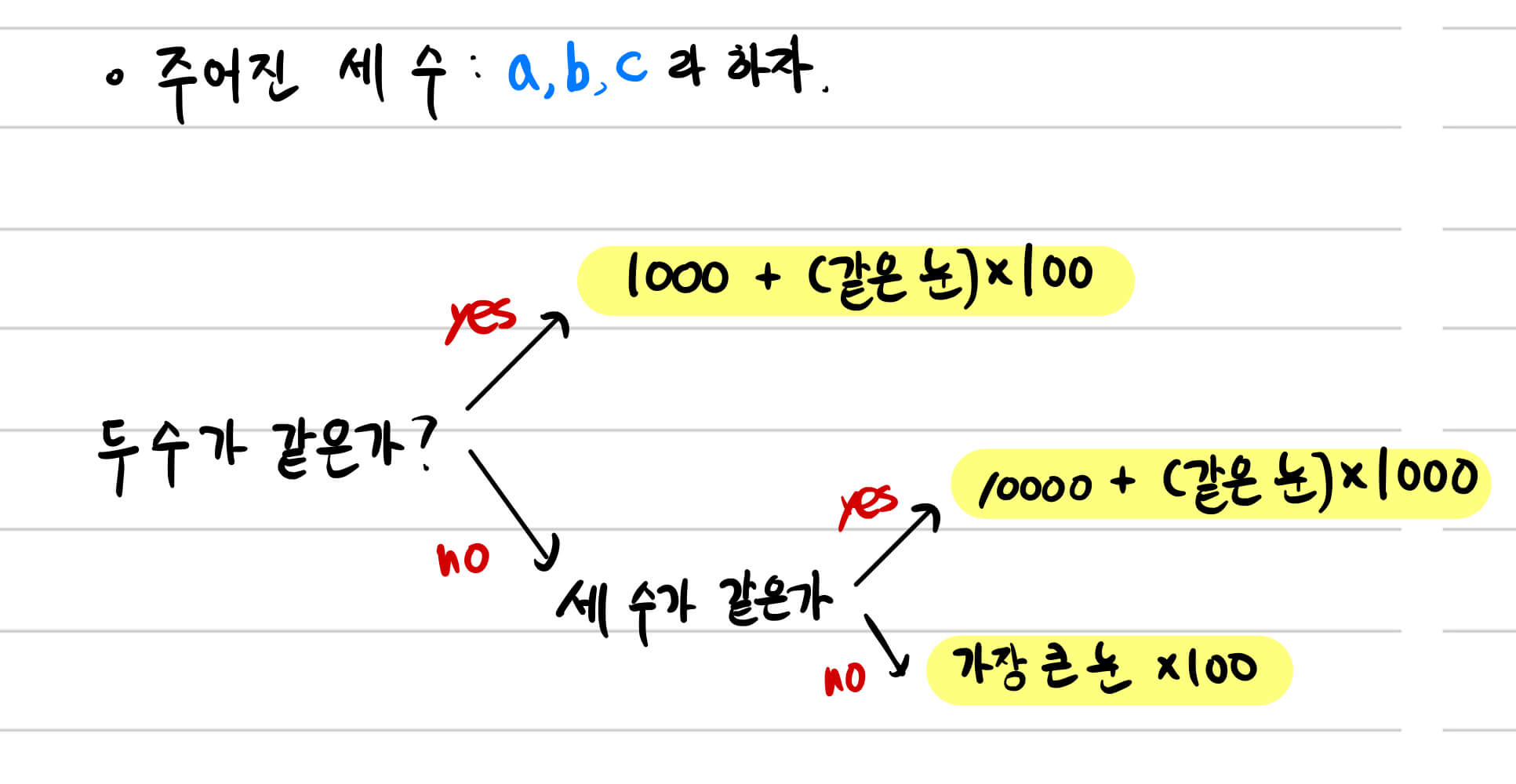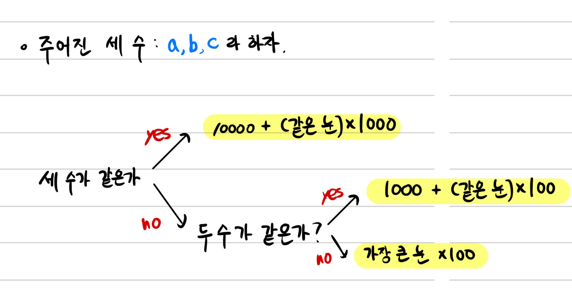 3개 주사위의 나온 눈이 주어질 때, 상금을 계산하는 프로그램을 작성 하시오. |