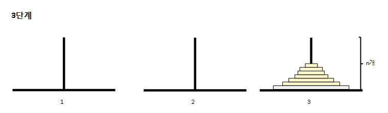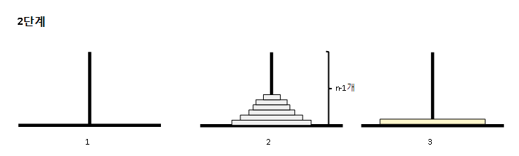 3단계 에서는 다시 n-1개의 원판을 2번 막대에서 3번 막대로 옮깁니다.