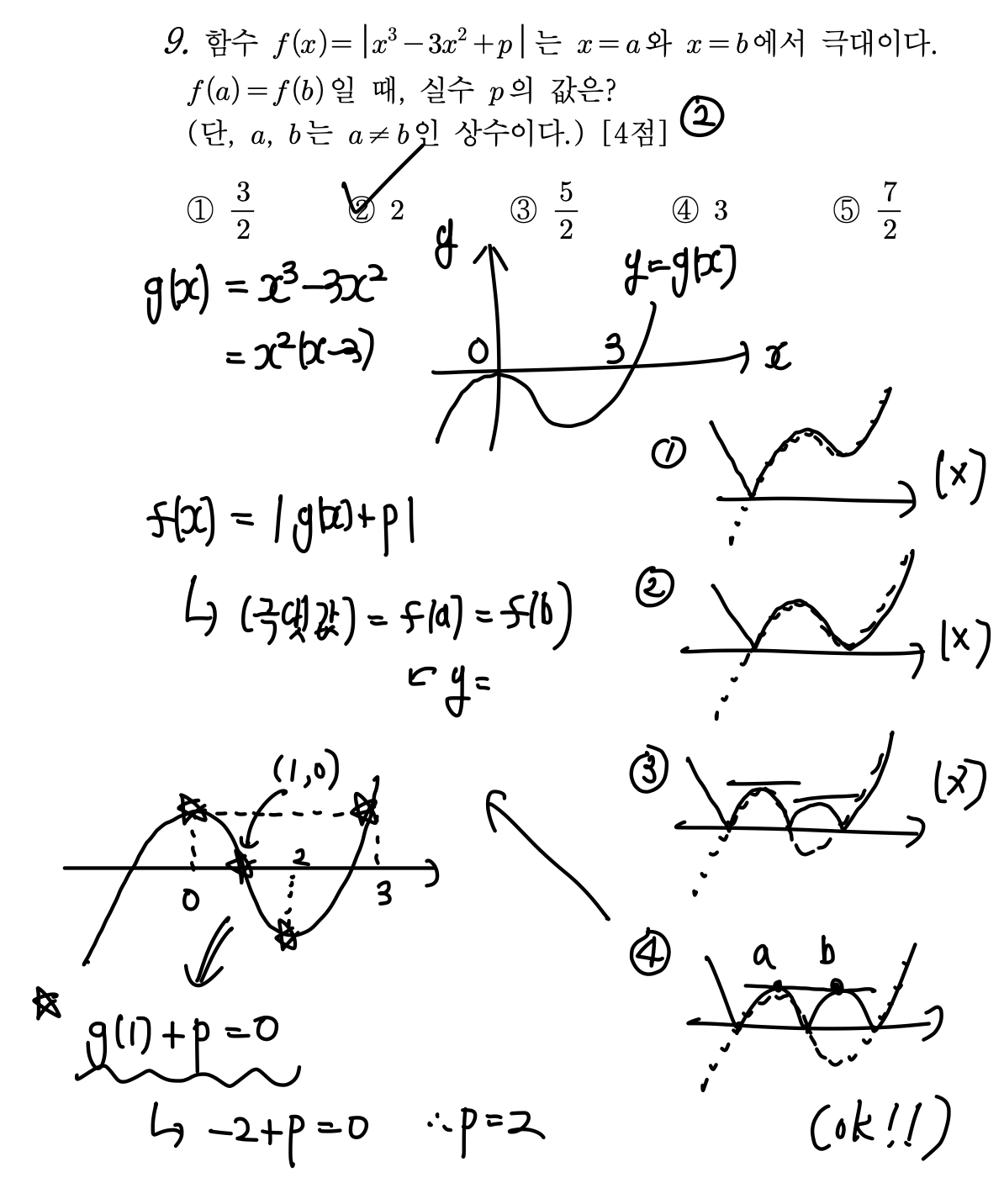 삼차함수의 다섯개의 특수한 점을 그래프에 찍었을 때, y = g(x) + p 그래프가 (1, 0)을 지나야 한다.