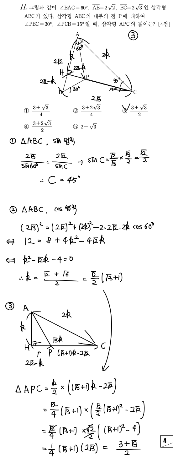이후 다시 △ABC에 cos 법칙을 적용하면 k값을 구할 수 있고,