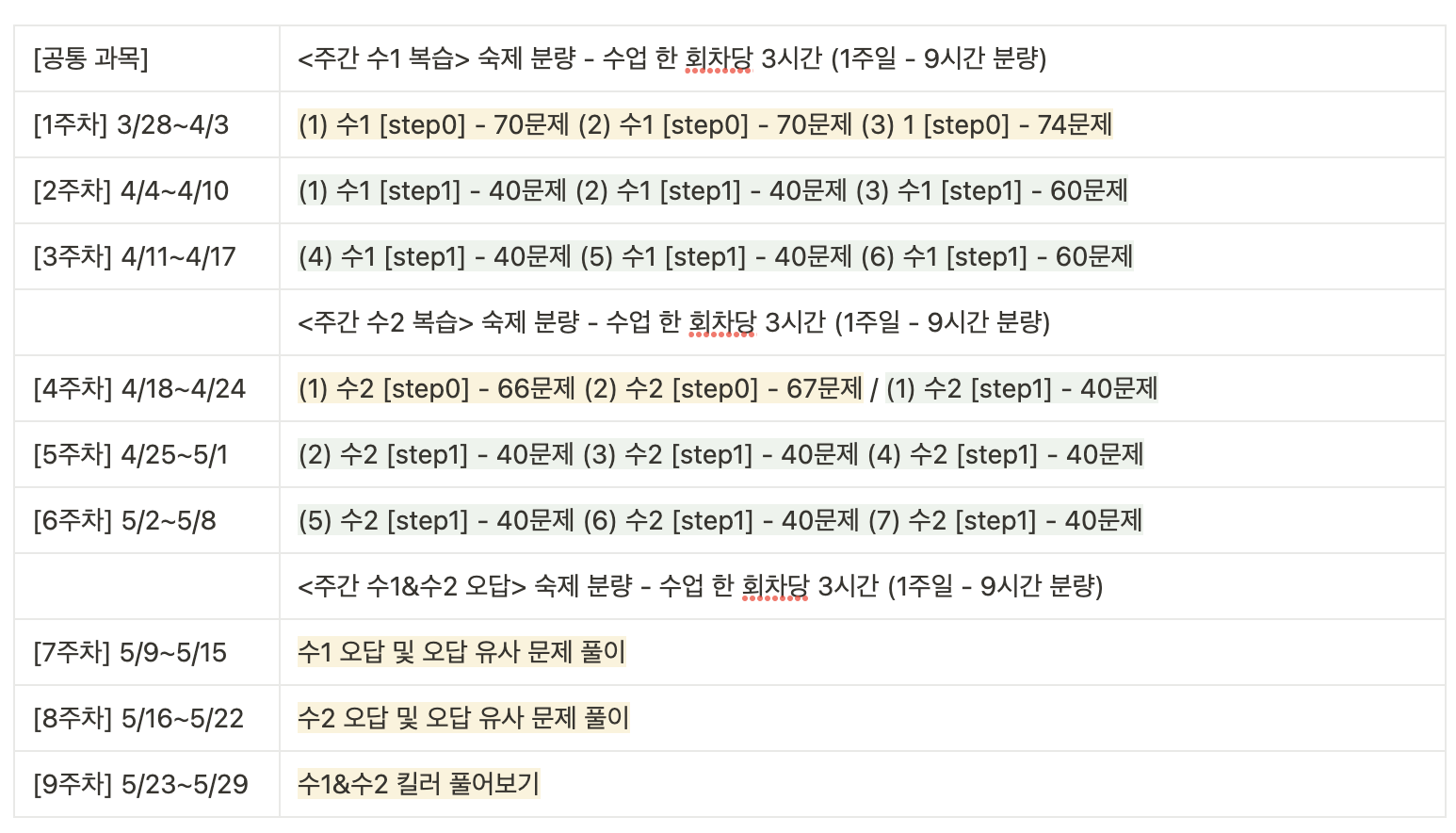 주별 목표 : <선택과목> - 매주 소단원 3개 / <공통과목> - 매주 150문제 정도