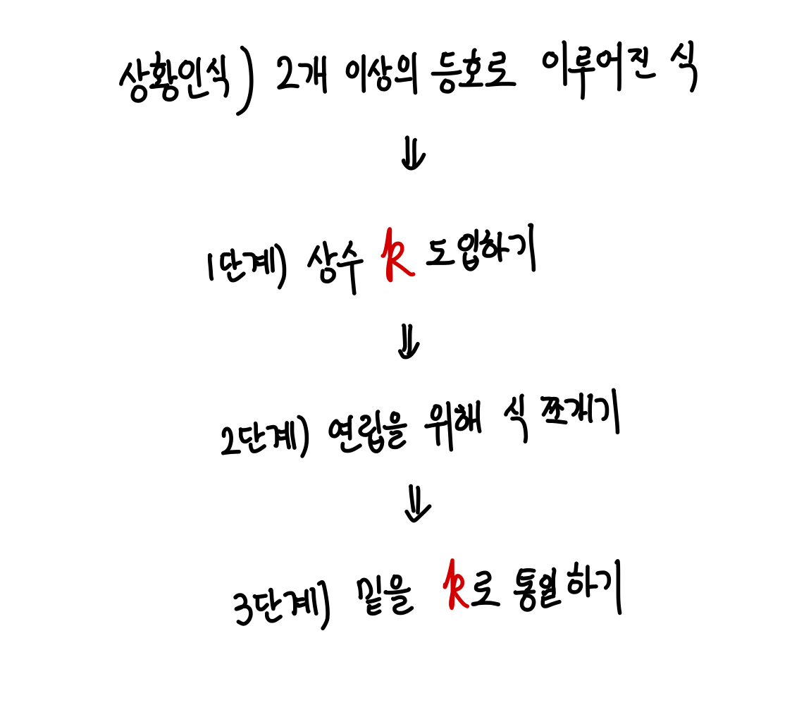 (가) 조건 -> "등호가 2개로 이루어진 식이네?" -> "새로운 상수를 도입해야 겠다 (k는 이미 있으니 l이 좋겠군)"