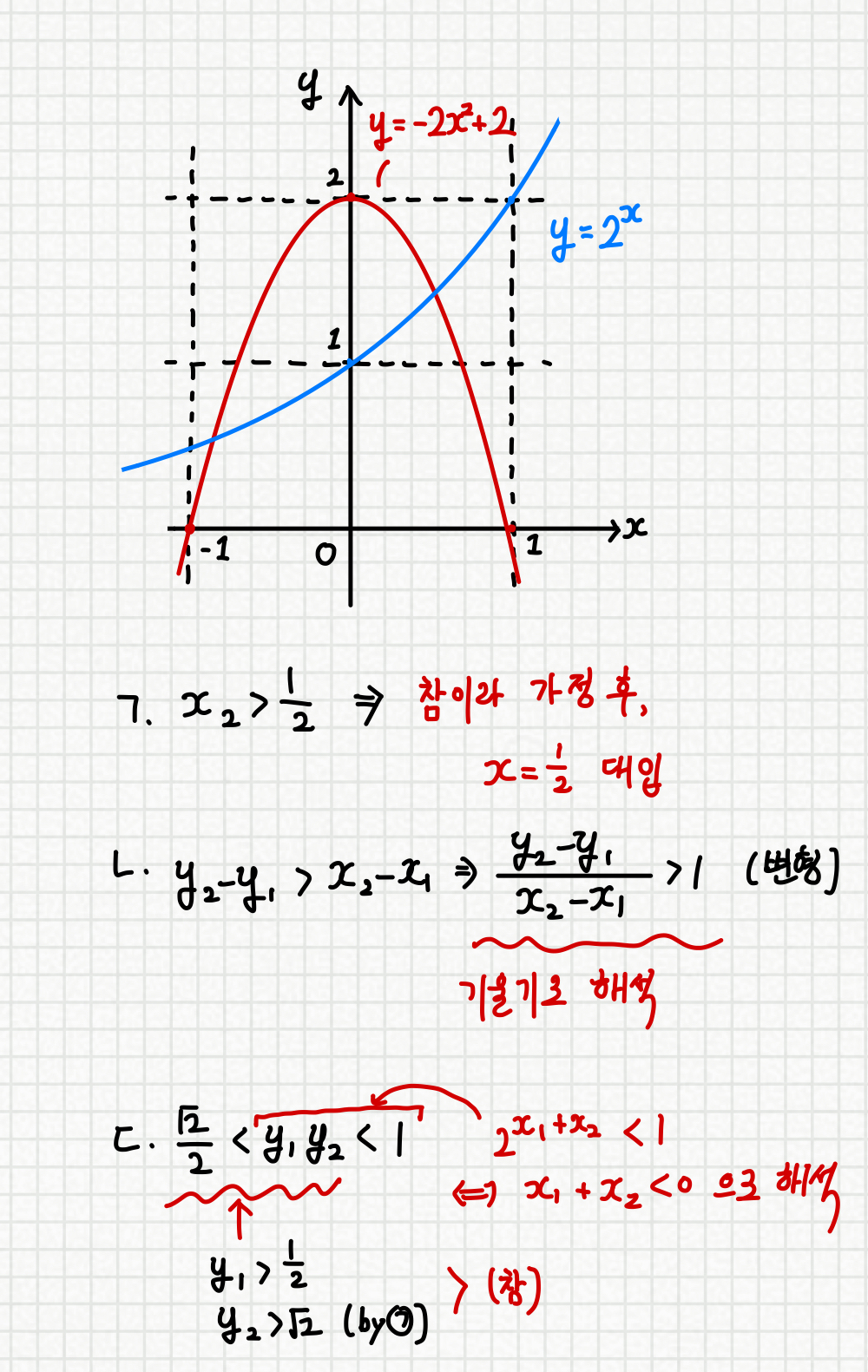 초록 직선의 기울기가 핑크 직선보다 완만하므로(작으므로), ㄴ 선지 또한 참이 됩니다.