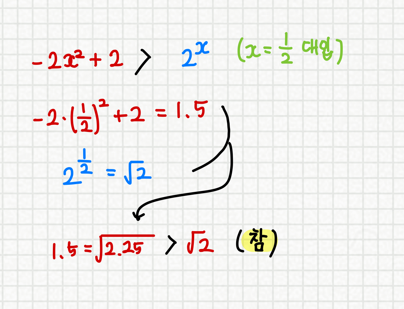그러므로, 초록 직선의 기울기가 1보다 큰지 작은지만 판단하면 되는데