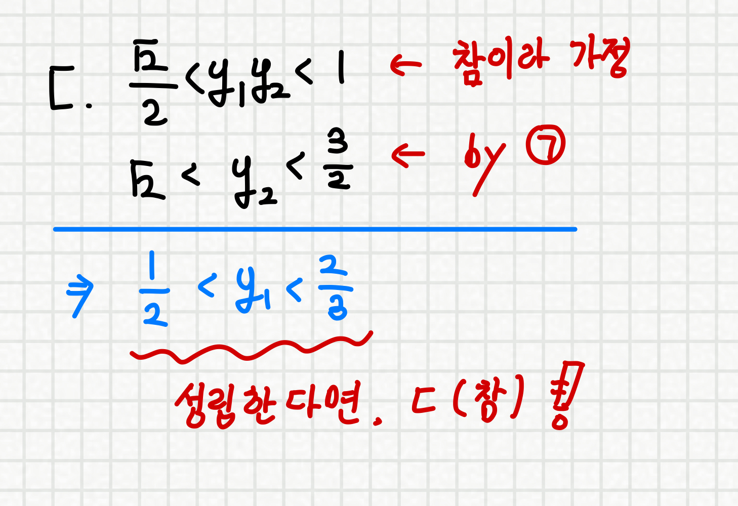 이를 기반으로, ㄷ이 맞다고 가정했을 때 y1의 범위는 다음과 같아야 합니다.