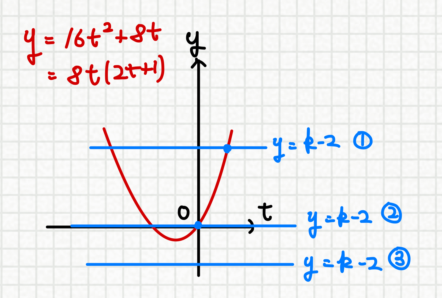 위의 그래프가 됩니다. 이때, y = k-2를 그을 수 있는 경우가 3가지 있는데
