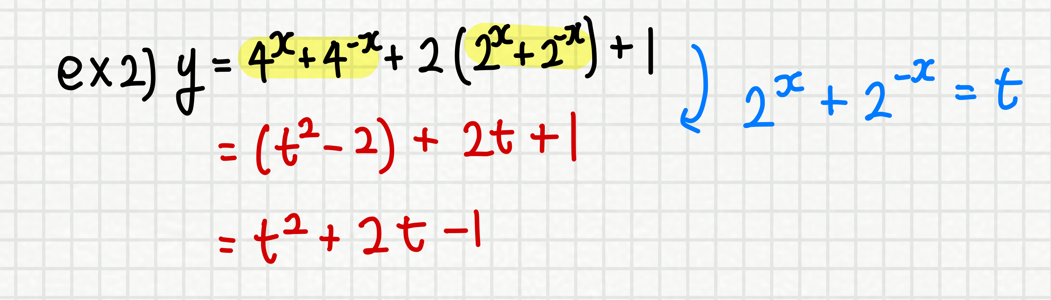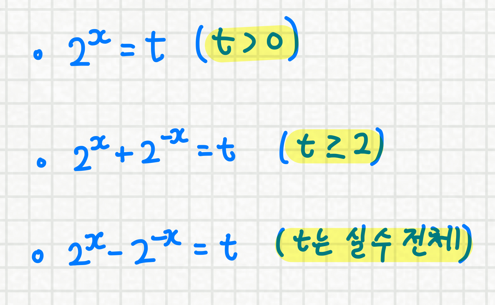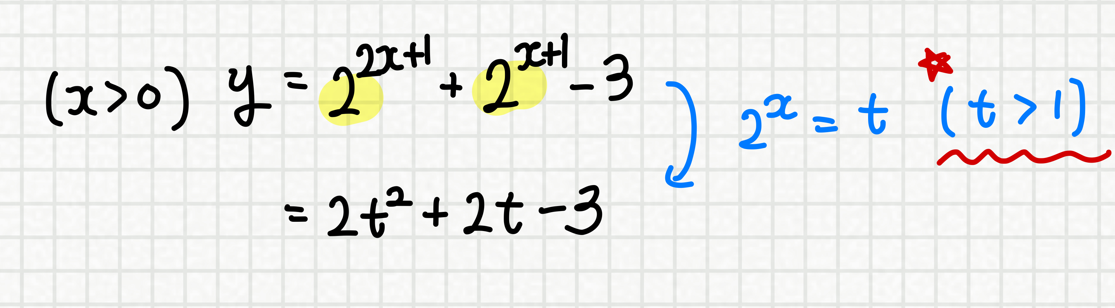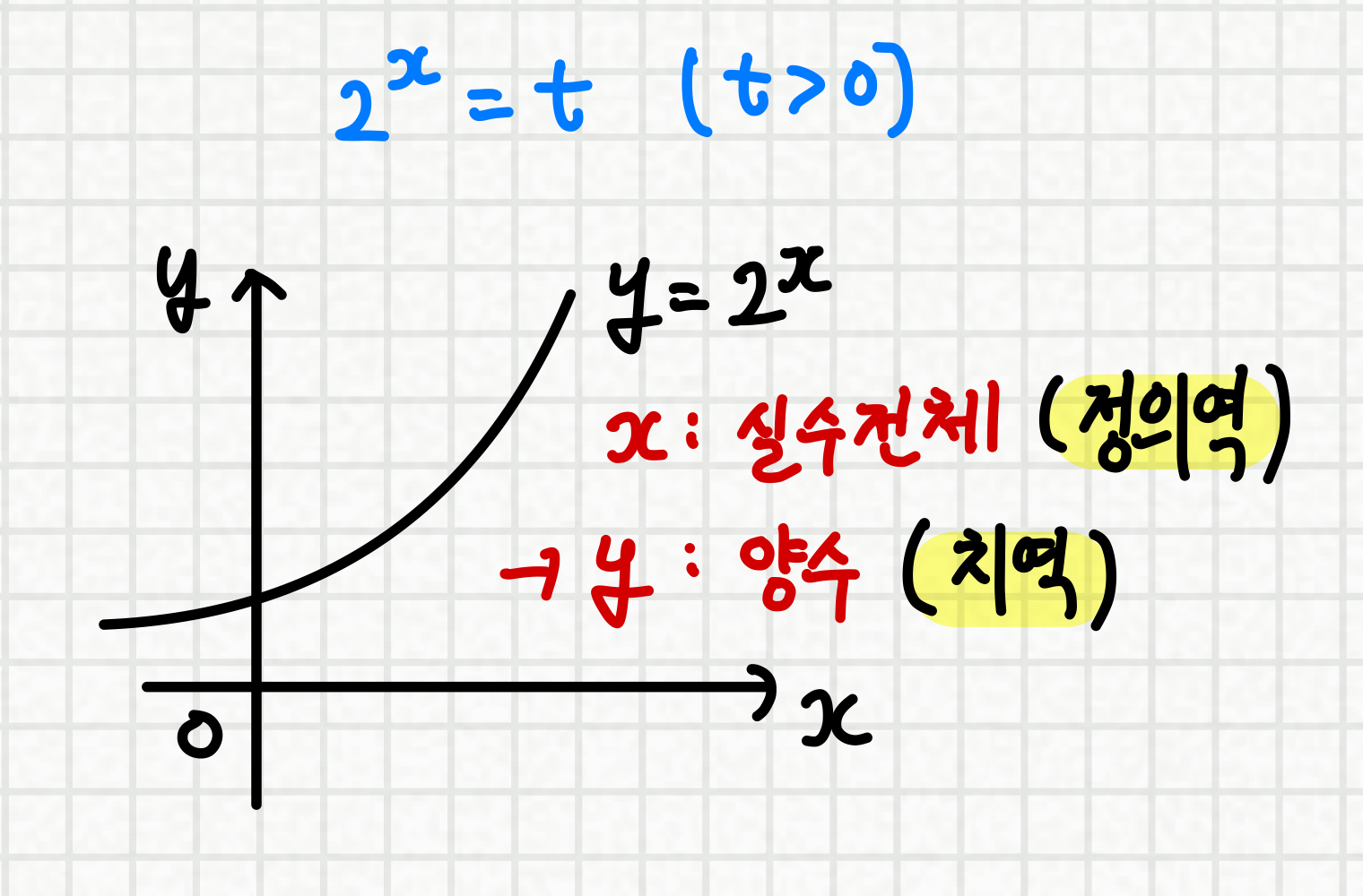 와 같이 t > 1로 치환해야 합니다. 그 이유는 아래와 같이 정의역-치역의 개념으로 이해할 수 있습니다.