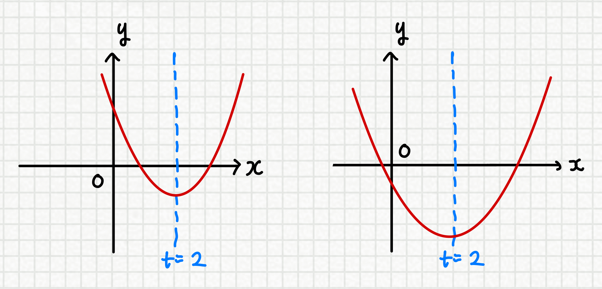 이때 주어진 이차 함수의 경우 t=2에서 축을 가집니다. (축이 t=2임을 발견하는 것이 실력!)